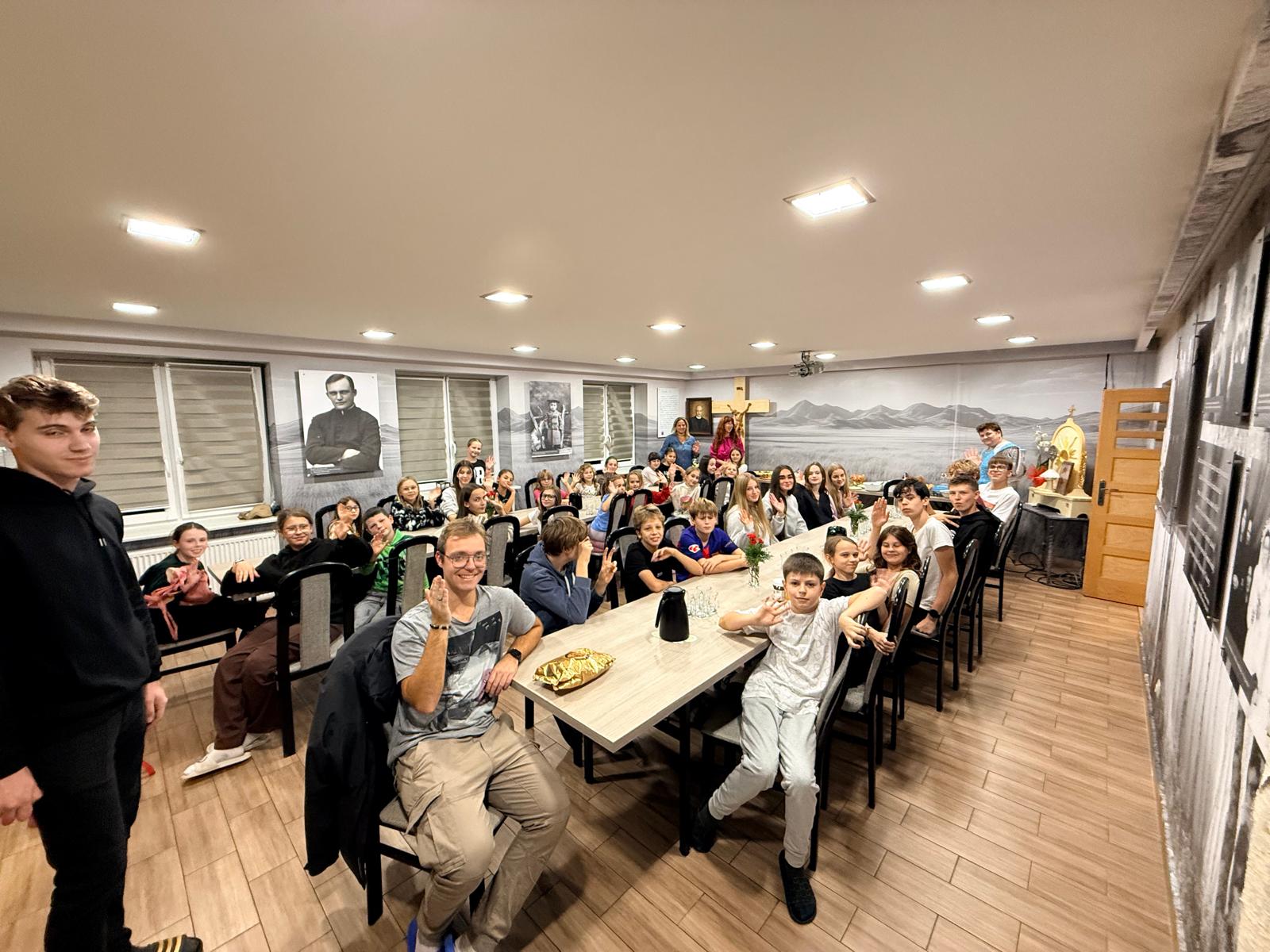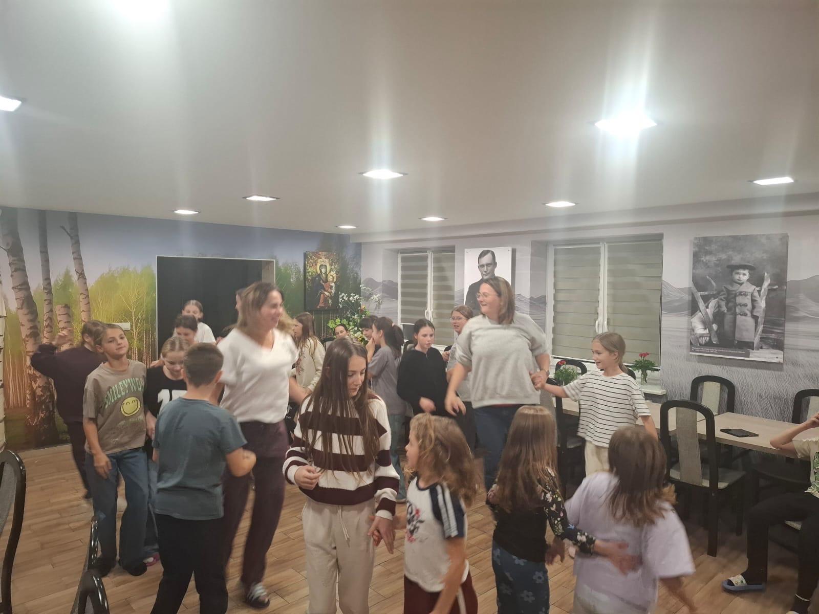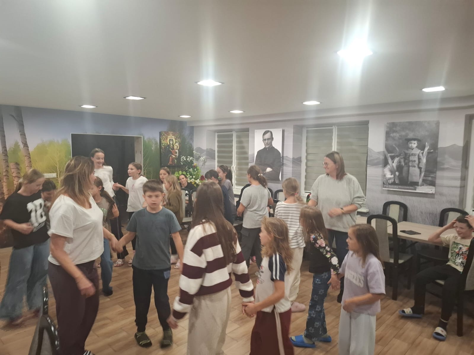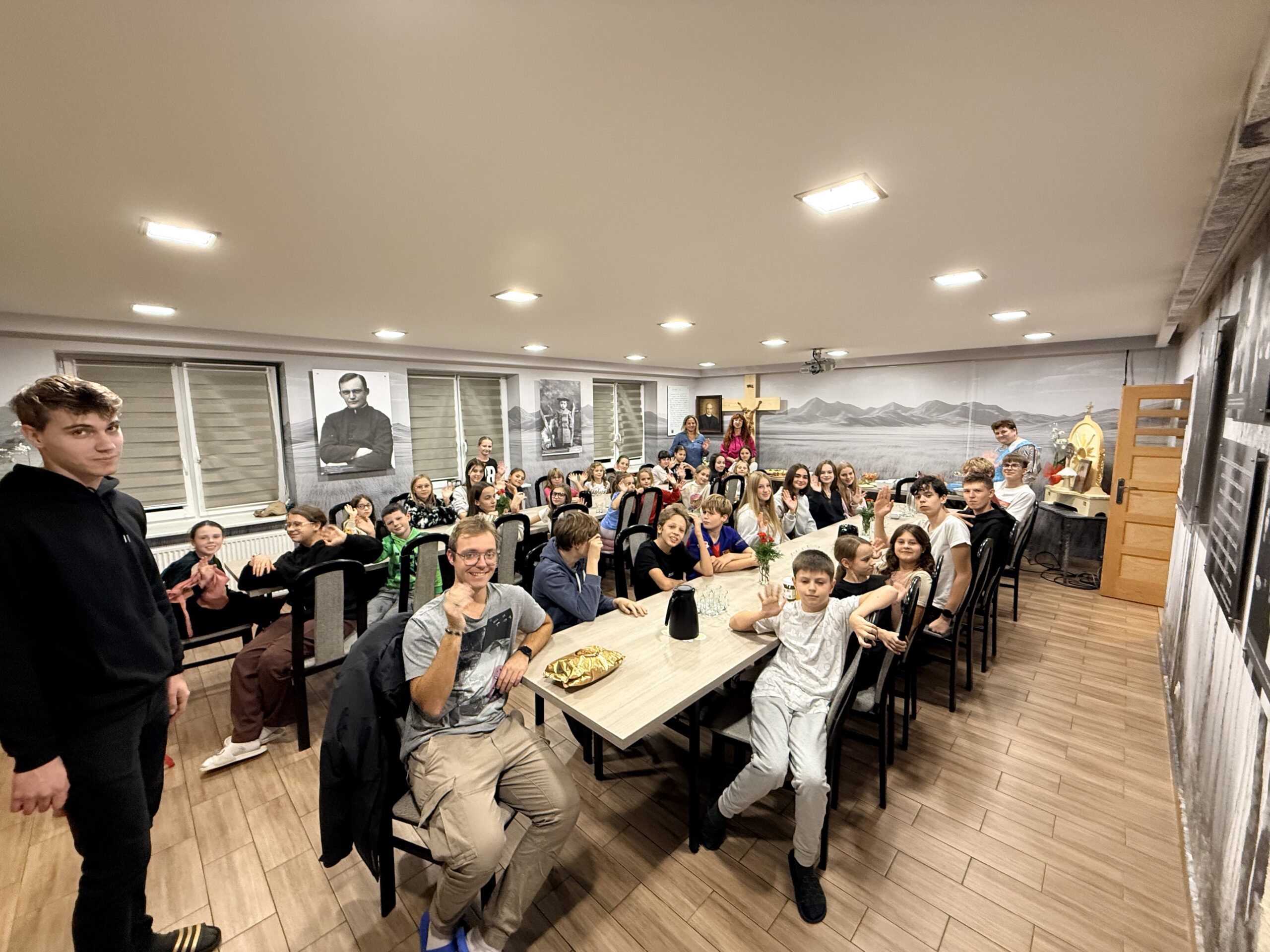 Po przyjeździe na miejsce, pierwsze ekscytacje- piękny, odremontowany Dom Rekolekcyjny ks. Władysława Bukowińskiego. Kiedy opadły emocje lokacyjne, wyraźnie było słychać burczenie w brzuchach, a w powietrzu unosił się kuszący zapach…Zapach dobiegał z kuchni, gdzie szanowne Panie kucharki- Beata i Brygida, szykowały same smakowitości. Po jedzonku, nadszedł czas, by rozpocząć część wyjazdu, która miała cel wzmocnienia duchowego/mentalnego. Przed księdzem niełatwe zadanie- tak poprowadzić konferencję, tak dobrać słowa, wątki, żeby zaciekawić i dzieci i młodzież…Na początek Msza Święta i pierwsza część cyklu rozważań, których głównymi Bohaterkami były Rut i Noemi. Tak naprawdę, to tylko 4 krótkie rozdziały w Piśmie Świętym a pokazują, jak wielka może być miłość. Co ciekawe, miłość synowej i teściowej – Rut i Noemi. Każdy z nas, ma w głowie różne żarty na temat teściowych. A jednak, taka miłość jest możliwa, choć wcale nie była to łatwa relacja. Można śmiało powiedzieć, że Rut jest nauczycielką miłości i oddania. Rut, to przykład dobra, uczynności i pracowitości. Jej życie udowadnia, że tylko całkowicie oddając się w ręce Jezusa, możemy być szczęśliwi i bezpieczni. To taka mała podpowiedź, jak żyć…Ksiądz Mariusz nakreślił też postać księdza Bukowińskiego, który w zasadzie, jest gospodarzem budynku. Następnie Krzysiek wraz z Mikołajem porwali całą grupę do zabawy. Misja- poznać się, by wspólnie świetnie spędzić ten czas. Było głośno, radośnie, właśnie tak, jak powinno być wśród Młodych 😊 Wieczór był baaardzo długi.