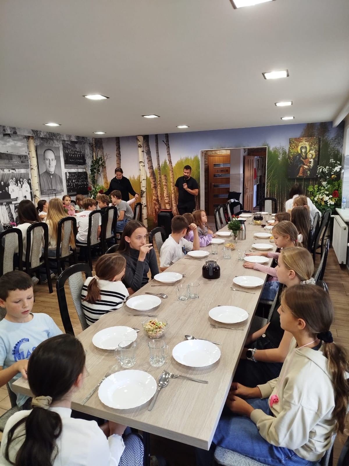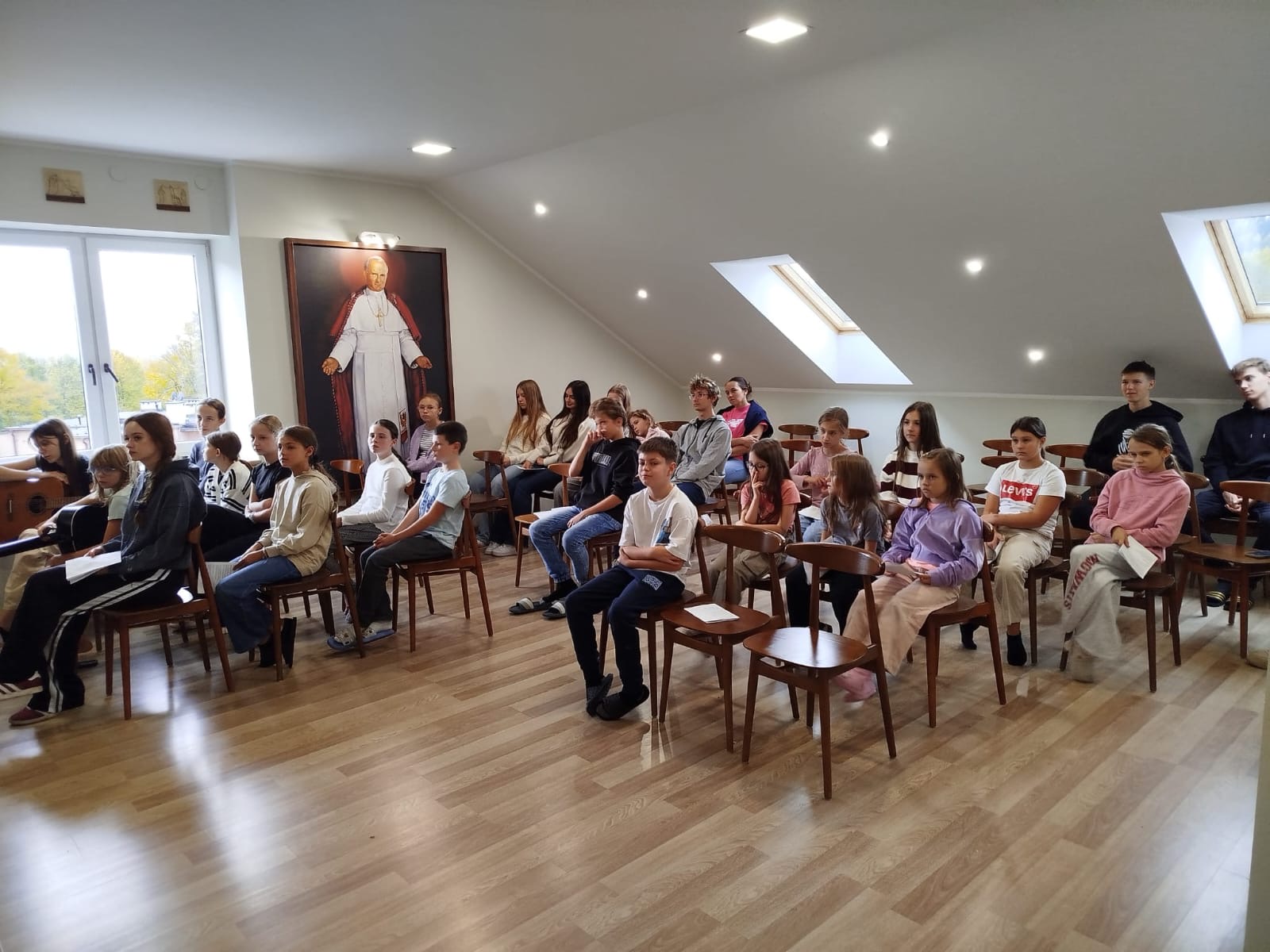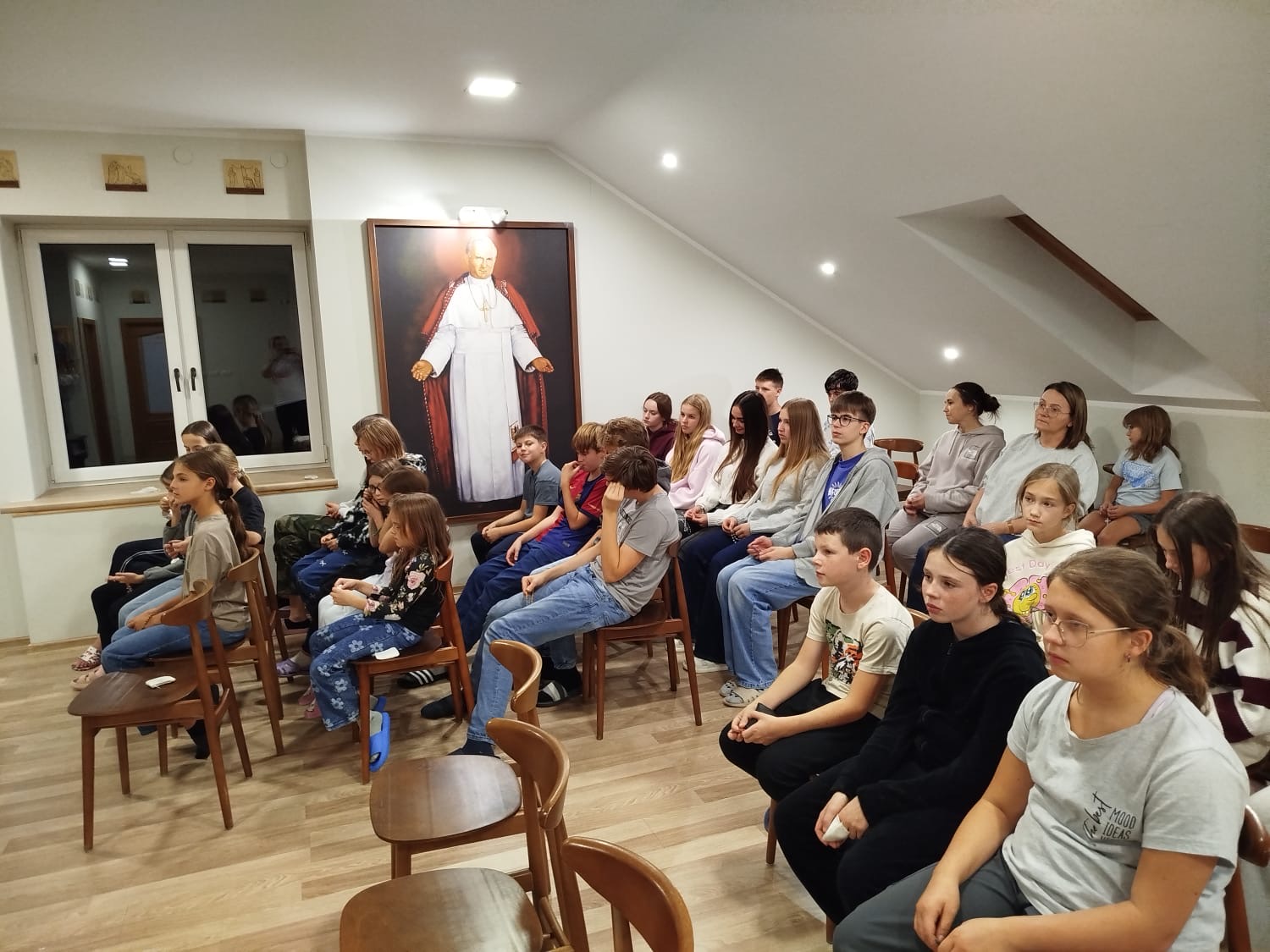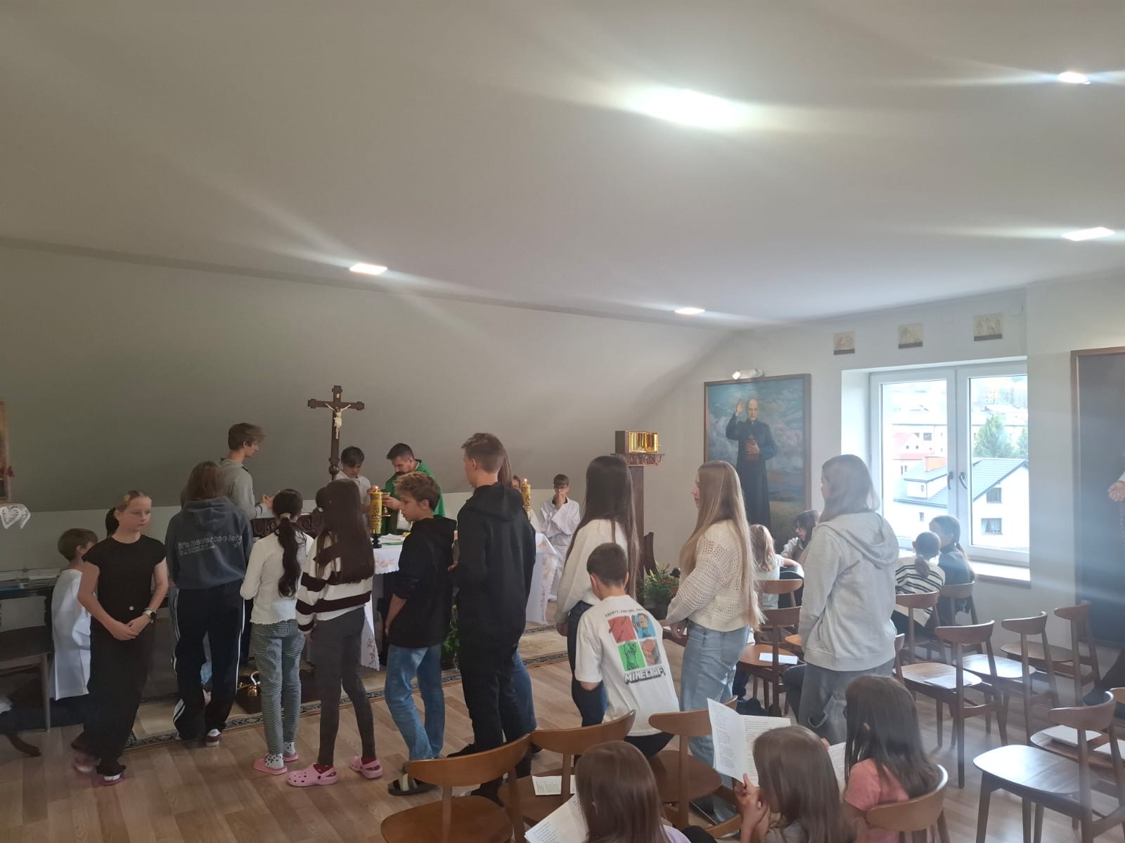Po przyjeździe na miejsce, pierwsze ekscytacje- piękny, odremontowany Dom Rekolekcyjny ks. Władysława Bukowińskiego. Kiedy opadły emocje lokacyjne, wyraźnie było słychać burczenie w brzuchach, a w powietrzu unosił się kuszący zapach…Zapach dobiegał z kuchni, gdzie szanowne Panie kucharki- Beata i Brygida, szykowały same smakowitości. Po jedzonku, nadszedł czas, by rozpocząć część wyjazdu, która miała cel wzmocnienia duchowego/mentalnego. Przed księdzem niełatwe zadanie- tak poprowadzić konferencję, tak dobrać słowa, wątki, żeby zaciekawić i dzieci i młodzież…Na początek Msza Święta i pierwsza część cyklu rozważań, których głównymi Bohaterkami były Rut i Noemi. Tak naprawdę, to tylko 4 krótkie rozdziały w Piśmie Świętym a pokazują, jak wielka może być miłość. Co ciekawe, miłość synowej i teściowej – Rut i Noemi. Każdy z nas, ma w głowie różne żarty na temat teściowych. A jednak, taka miłość jest możliwa, choć wcale nie była to łatwa relacja. Można śmiało powiedzieć, że Rut jest nauczycielką miłości i oddania. Rut, to przykład dobra, uczynności i pracowitości. Jej życie udowadnia, że tylko całkowicie oddając się w ręce Jezusa, możemy być szczęśliwi i bezpieczni. To taka mała podpowiedź, jak żyć…Ksiądz Mariusz nakreślił też postać księdza Bukowińskiego, który w zasadzie, jest gospodarzem budynku. Następnie Krzysiek wraz z Mikołajem porwali całą grupę do zabawy. Misja- poznać się, by wspólnie świetnie spędzić ten czas. Było głośno, radośnie, właśnie tak, jak powinno być wśród Młodych 😊 Wieczór był baaardzo długi.